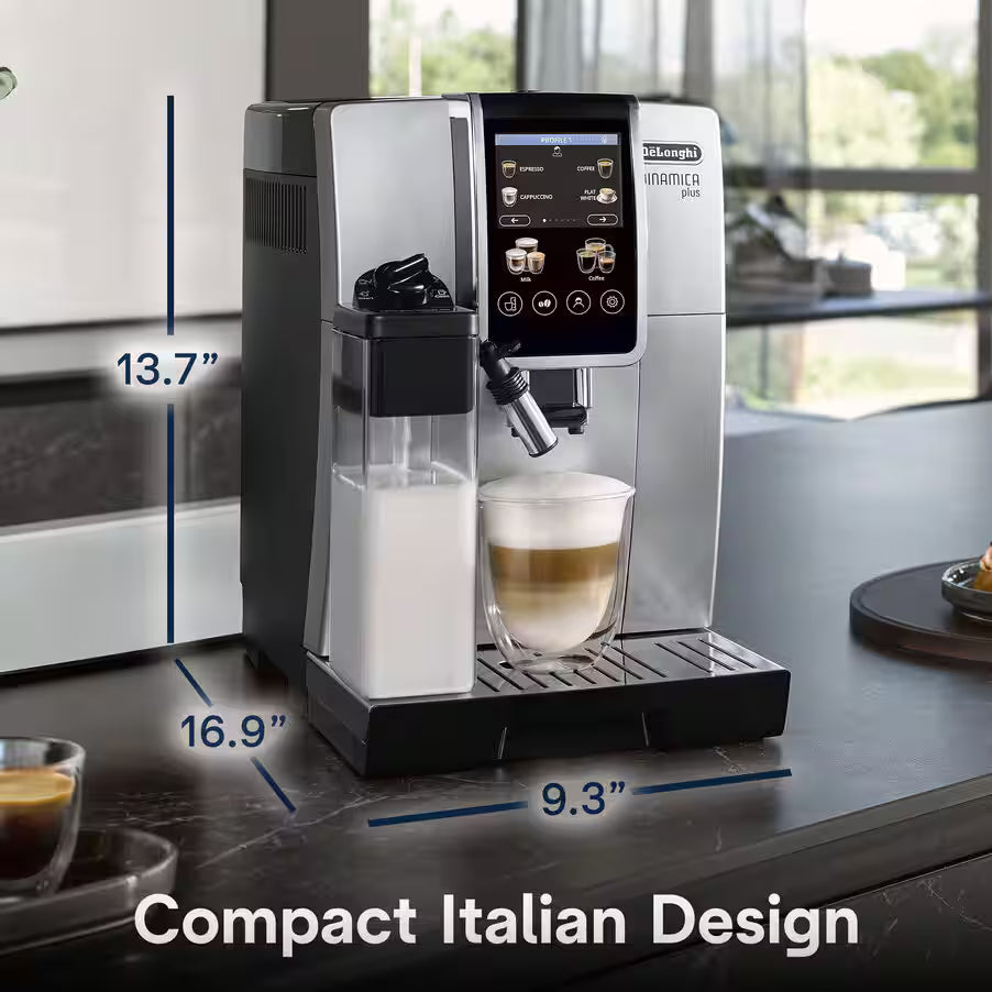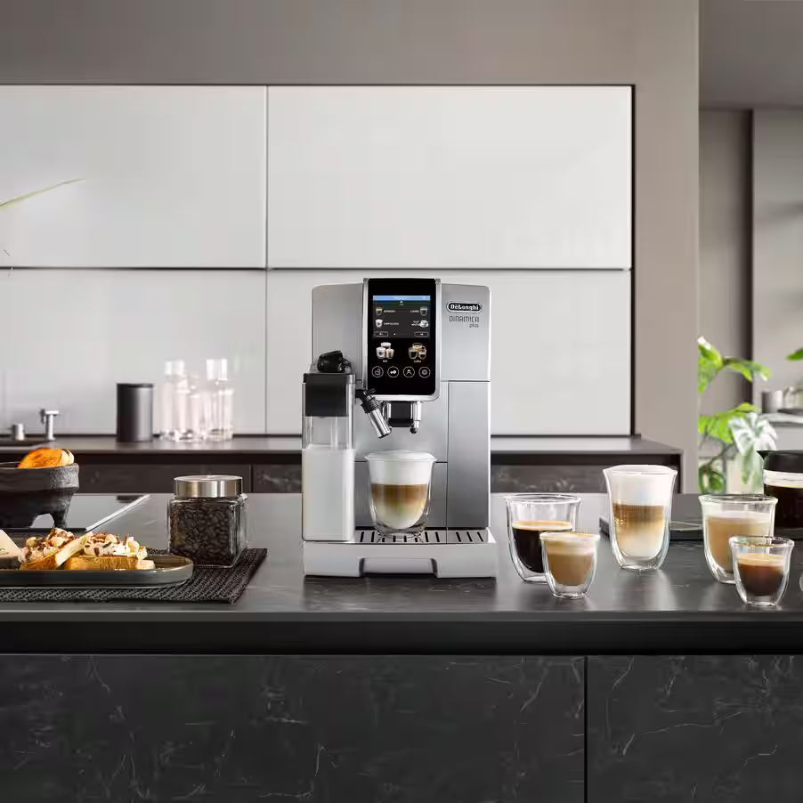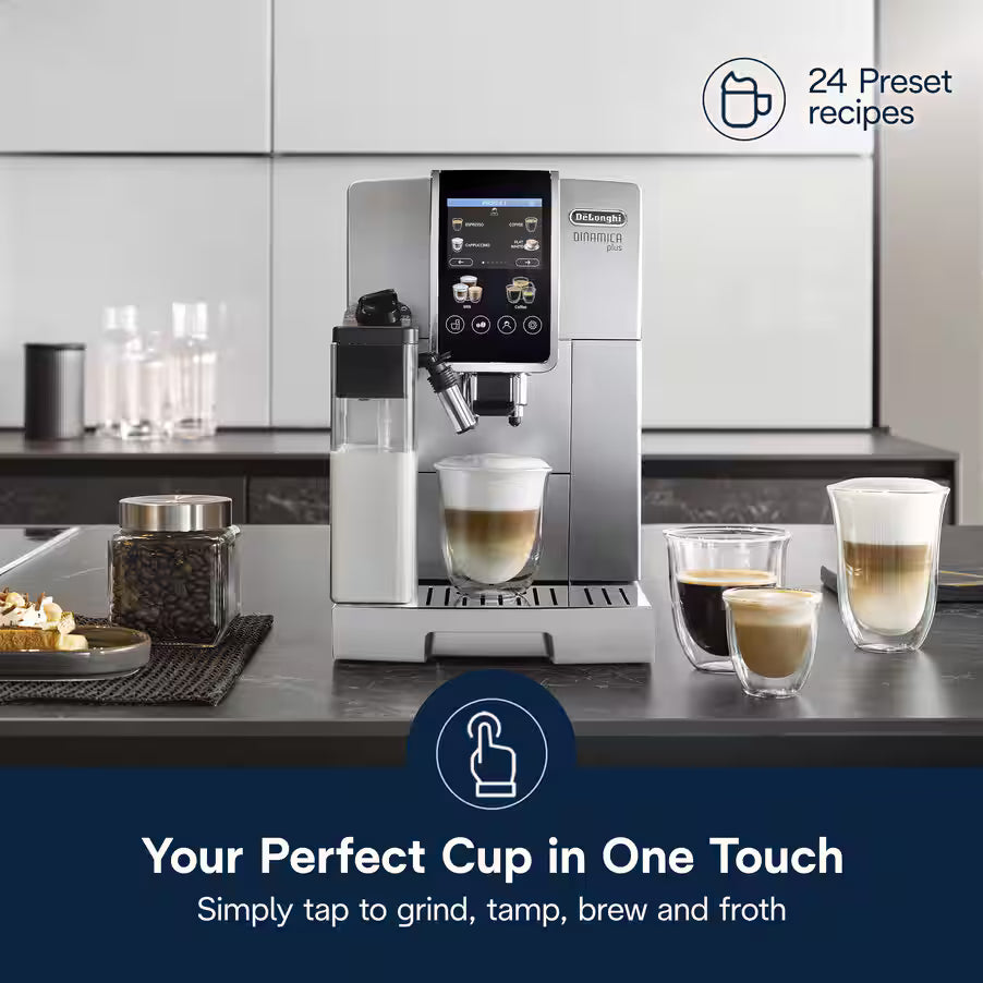 Bring the café experience home with the Dinamica Plus. Craft your favorite espresso recipes, including lattes, cappuccinos, flat whites, and cortados all at the touch of a button. The built-in conical burr grinder and brewing unit deliver the freshest espresso with the perfect grind, dose, and brew every time. With our proprietary LatteCrema™ System, personalize milk texture with 3 froth settings to expertly froth milk and milk alternatives. With the Dinamica Plus, enjoy your favorite espresso recipes from around the world - all at the touch of a button.