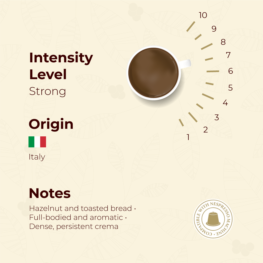 A classic Italian espresso profile with aromatic hazelnut and toasted bread notes. This blend of Arabica and Robusta produces a dense crema and full-bodied taste. A true homage to the Italian café tradition